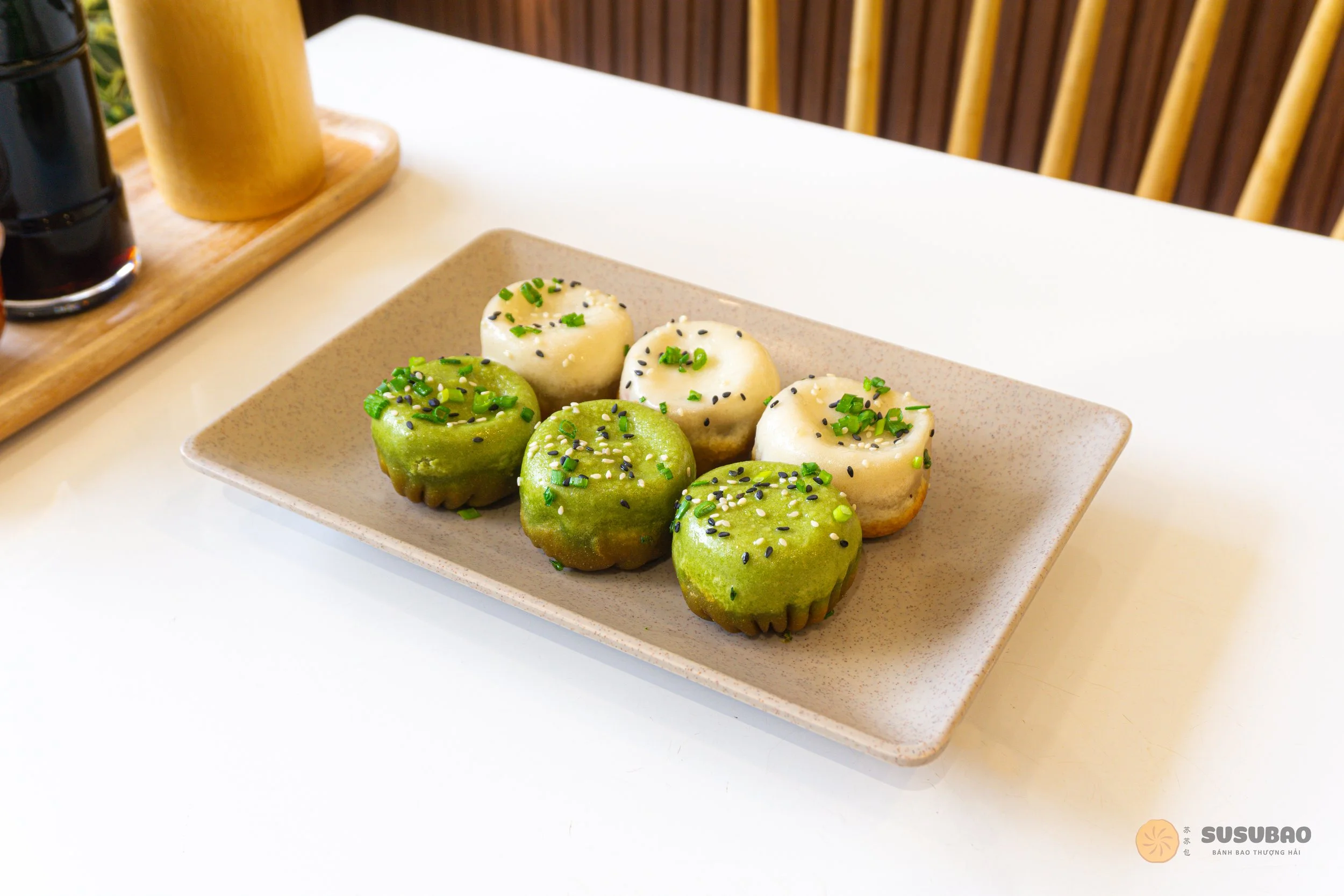 Lục Thanh Bao (香菇青菜) có màu sắc và mùi thơm của lá dứa, bao phủ bên ngoài để che đi lớp thịt được ướp, trộn và hòa tan cùng hỗn hợp rau trong công thức mới lạ. Bánh bao Lục Thanh đảm bảo sẽ mang đến cho bạn một nụ cười và cảm giác khi thưởng thức xong.